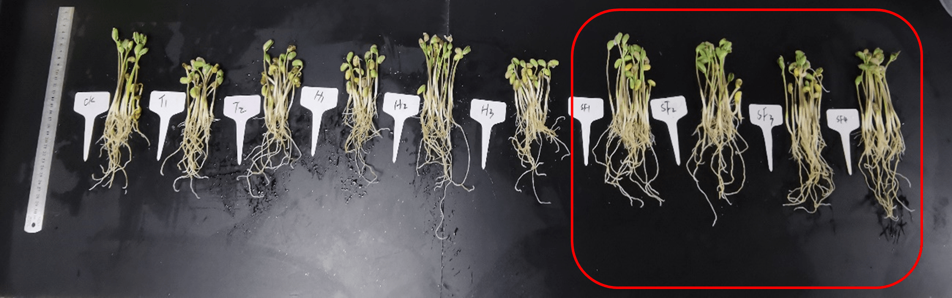 (2)測試了在低溫與高溫條件下,花粉多糖對大豆幼苗生長的影響。對比其他生物刺激素,花粉多糖在高低溫逆境條件下,可顯著促進(jìn)大豆根長、莖粗及鮮重增加,其中高溫條件下大豆根長根重分別增加了20.45%、55.58%,顯著優(yōu)于其它生物刺激素效果。