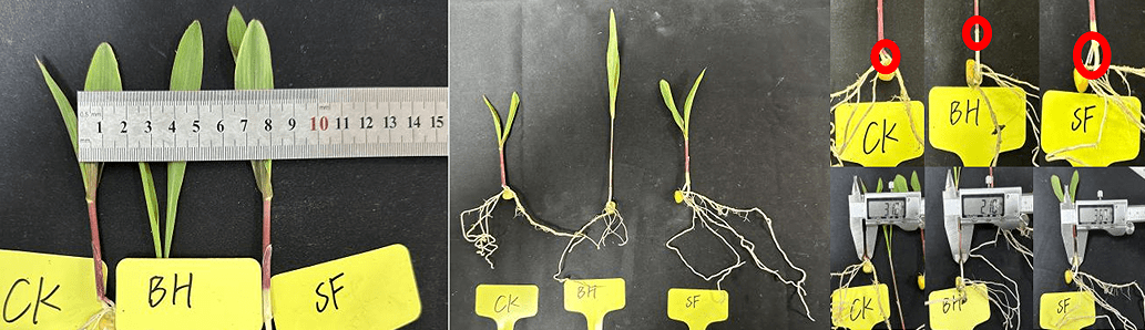 (1)針對玉米作物:在14℃~22℃培養(yǎng)條件下,對比其他種子處理劑,采用50g/100kg花粉多糖進(jìn)行玉米拌種處理,試驗(yàn)27天后發(fā)現(xiàn),花粉多糖處理后玉米株高生長雖弱于其他種子處理劑,但莖粗、根鮮重、氣生根長出率及氣生根根長均顯著優(yōu)于,其中明顯看出其他種子處理劑處理后,玉米未生長出氣生根。說明花粉多糖拌種玉米,可明顯增加玉米氣生根生長,提升玉米后期抗倒伏能力。