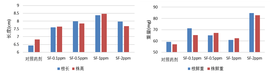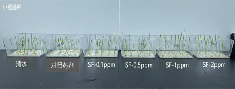 (2)針對小麥作物:浸種處理后發(fā)現(xiàn),試驗(yàn)范圍內(nèi)的花粉多糖對小麥株高、根長、株重、根重均具有促進(jìn)作用,其中在2 ppm處理下,相比陽性對照處理,花粉多糖處理后小麥株高、根長、株重及根重分別增長12%、24%、45%、43%。